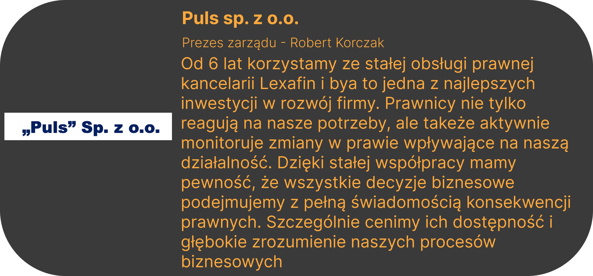 Prawnik i doradca podatkowy na żądanie, bez kosztowych niespodzianek. Stała opieka zespołu, odpowiedź w 24 h, szybkie konsultacje 1:1, przegląd umów, aktualizacje wzorów i monitoring zmian przepisów.